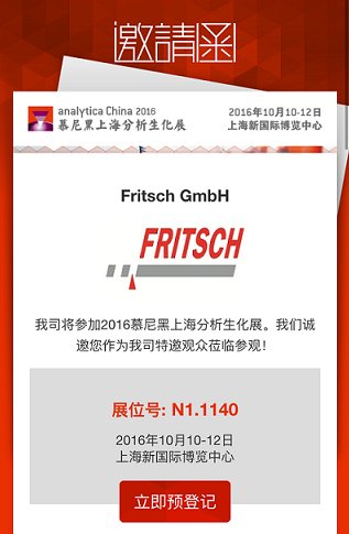 第八屆慕尼黑上海分析生化展(analytica China 2016)將于2016年10月10日-12日在上海新國(guó)際博覽中心隆重舉行,德國(guó)飛馳(FRITSCH)攜新的樣品制備和粒度分析設(shè)備(納米行星式球磨機(jī)Pulverisette6加強(qiáng)型、Pulverisette7加強(qiáng)型,納米激光粒度儀Analysette 22 NanoTec,動(dòng)態(tài)顆粒圖像分析儀Analysette 28 ImageSizer),誠(chéng)邀您參加此次盛會(huì),并就樣品研磨、粉碎和顆粒的粒徑、粒形分析,與您共同探討理想的解決方案。