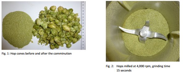 啤酒是眾多人喜愛的一種酒水,而釀造啤酒將會用到啤酒花,此花中有許多物質有藥理作用,會對人們的身體產生影響。許多次生植物的物質,如腐殖質,石竹烯,以及某些植物染料具有消炎和舒緩的效用,可能它們包含了與身體自身睡眠荷爾蒙褪黑激素有關的與物種相關的作用機制。為了這些物質的提取分析,需要將新鮮的雌蛇麻球果進行粉碎,如圖: