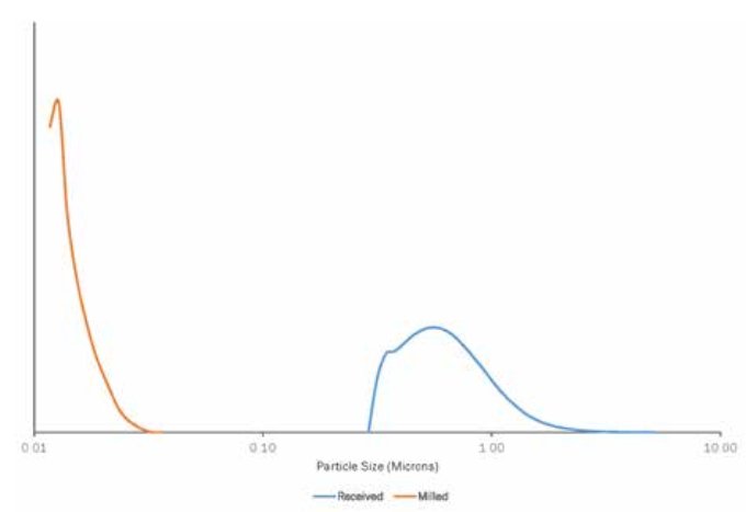 藍(lán)色表示研磨前鈦酸鋇粒徑分布;紅色表示研磨后的粒徑分布。