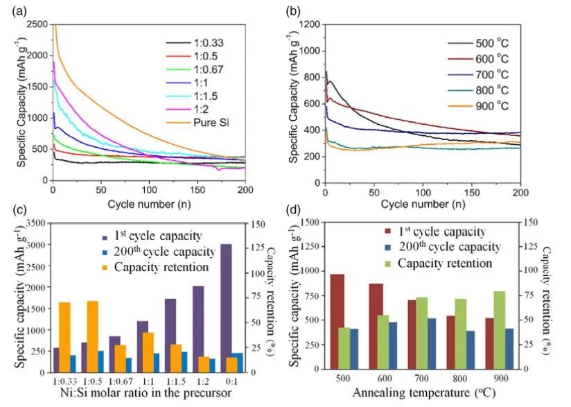 Si@NixSi/Ni 核的組成和形態(tài)-殼結(jié)構(gòu)受退火溫度和前體樣品摩爾比的顯著影響。樣品的容量保持率隨著 Si 摩爾比的增加而急劇下降。 Ni/Si 摩爾比為 1:0.5 的電極表現(xiàn)出最佳性能,具有合理更高的比容量和出色的穩(wěn)定性。與原始 Si 電極相比,Si@NixSi/Ni 核殼電極表現(xiàn)出更好的循環(huán)性能。