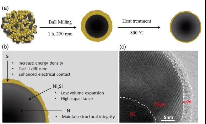 首先使用高能球磨研磨Ni和納米硅顆粒1小時,產(chǎn)生Ni– Si核殼結(jié)構(gòu)。然后,預(yù)活化的核-殼納米結(jié)構(gòu)在惰性Ar氣氛中在 800 C下退火4小時,使硅化鎳在Si-Ni界面之間生長。在硅化物形成過程中,鎳原子通過鎳/硅化物界面向外擴(kuò)散,而硅原子通過硅化物/硅界面向內(nèi)擴(kuò)散。