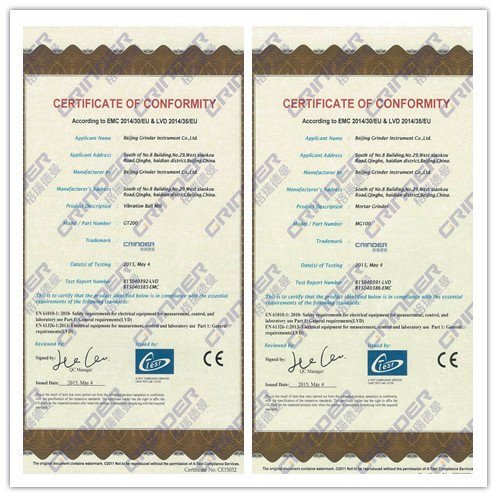近日,我公司幾個旗艦產品先后獲得歐盟CE安全認證證書,這充分印證公司一直以來對卓越質量的追求理念,對客戶安全保護的承諾。認證產品包含高能臼式研磨儀MG100和震動球磨儀GT200系列產品, CE證書的獲得標志著北京格瑞德曼儀器設備有限公司取得了順利進入歐盟及歐盟自由貿易協會國家市場的通行證,為公司海外市場的開拓奠定了基礎。