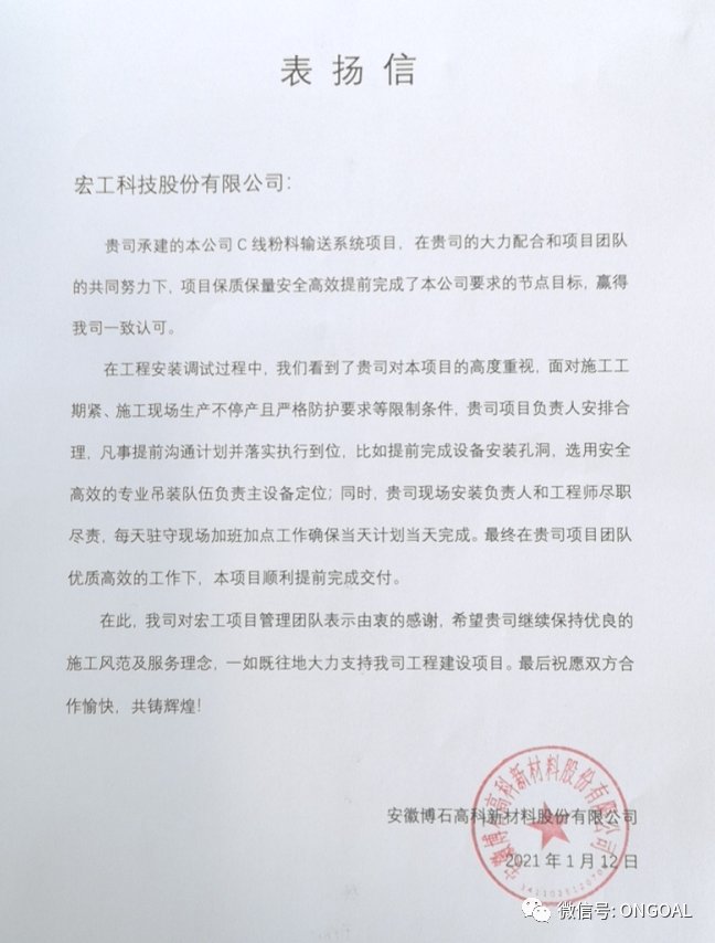 1月12日,安徽博石高科新材料股份有限公司(以下簡稱:博石高科)的C線粉料輸送項目確認保質(zhì)保量圓滿完成,并得到了博石高科專門發(fā)函對宏工及項目施工管理團隊提出表揚。