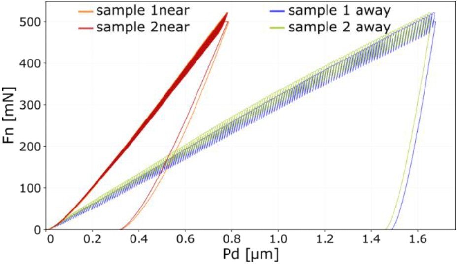 儀器化納米壓痕測試方法中應力應變分析的另一個經典應用是研究金屬焊縫周圍的彈塑性,尤其是軟金屬,例如鋁合金。鋁合金比鋼對高溫更敏感,因此,研究鋁合金的焊接熱效應尤為更重要。在本應用所提及的研究中,在加載過程中使用正弦波動態加載模式,利用球形納米壓痕針尖的特性對兩種不同的鋁合金焊縫附近的彈塑性行為進行局部表征。球形納米壓痕針尖用于確定靠近焊縫(區域A)且距離焊縫約2mm(區域B)的應力應變特性。