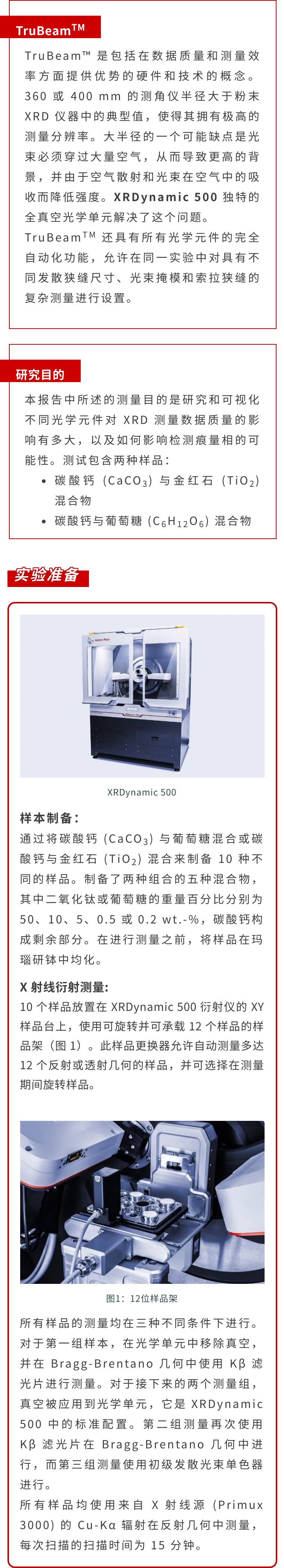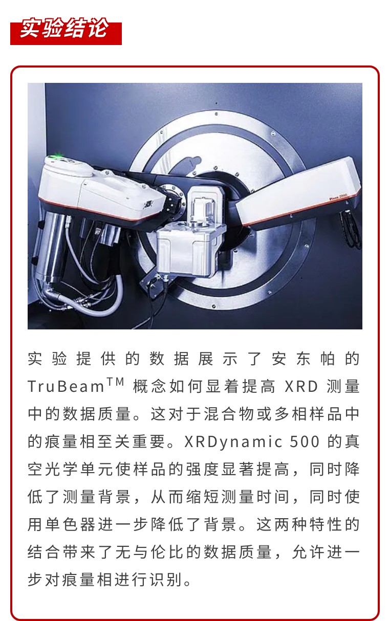 X 射線衍射 (XRD) 是對(duì)多晶樣品(如粉末或塊體材料)進(jìn)行定量和定性分析的標(biāo)準(zhǔn)方法。很難識(shí)別材料中包含的所有物相,并量化每個(gè)物相的正確相對(duì)含量。這在多相體系中尤其如此,其中某些物相只占整個(gè)體系的百分之幾。高數(shù)據(jù)質(zhì)量、高分辨率和低背景噪音在這方面有很大幫助。Anton Paar 全自動(dòng)多功能粉末 X 射線衍射儀 XRDynamic 500 是此類測(cè)量的完美選擇,因?yàn)槠鋵@腡ruBeamTM 概念將無(wú)與倫比的數(shù)據(jù)質(zhì)量和測(cè)量效率相結(jié)合。