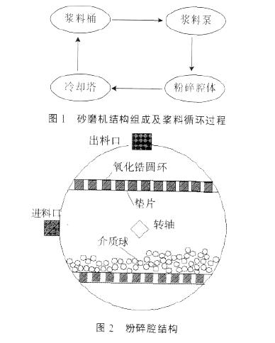 砂磨機的結(jié)構(gòu)一般由4 部分組成, 如圖1 所示,有漿料桶、漿料泵、粉碎腔及轉(zhuǎn)動系統(tǒng)、冷卻系統(tǒng)。一定粘度的漿料在泵作用下。進入粉碎腔( 粉碎腔結(jié)構(gòu)見圖2) , 與高速轉(zhuǎn)動( 轉(zhuǎn)速1 600~2 200 r/min) 的介質(zhì)球接觸, 粉料顆粒受到介質(zhì)球的沖擊碰撞和研磨而碎裂。同時, 在轉(zhuǎn)子的帶動下, 漿料隨介質(zhì)球一起高速滾動, 顆粒受到流體剪切力的作用而碎裂。從粉碎腔內(nèi)流出的漿料經(jīng)冷卻塔回到漿料桶, 再次重復前述粉碎過程。砂磨機粉碎是個循環(huán)粉碎作業(yè)過程,顆粒在不斷的沖擊碰撞和剪切力作用下實現(xiàn)粉碎,得到的顆粒粒度細且粒徑分布窄。