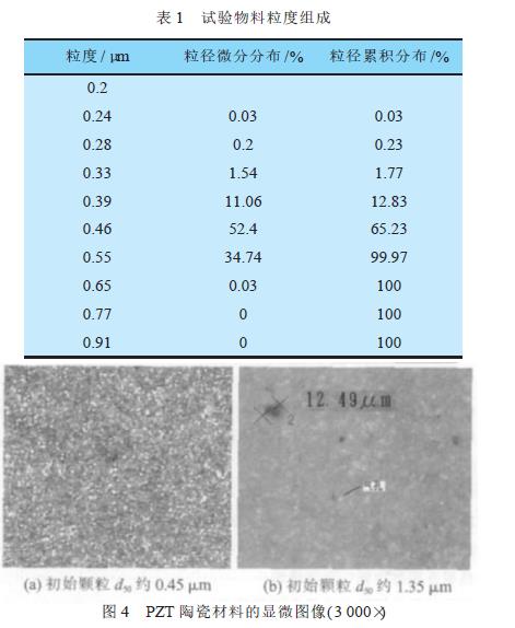 試驗選用的粉料是本公司生產(chǎn)使用的鋯鈦酸鉛( PZT) 粉料, 其密度約7.6 g/cm3, 試驗所用砂磨機是日本三井礦山株式會社產(chǎn)SC150A 型試驗機( 粉碎腔容積1.3 L) 。PZT 粉料先用攪拌磨粉碎至顆粒平均粒徑d50 約1.50 #m, 后將漿料注入砂磨機中二次粉碎。試驗所用初始粉料顆粒約40 kg( 同水混合的漿料共約65 kg) , 經(jīng)砂磨機粉碎作業(yè)約4 h 后, 測試顆粒粒度, 所得結(jié)果見圖3 及表1。粉碎后的顆粒粒徑小、粒度分布窄。顆粒平均粒徑d50 約0.45 $m 時, ***粒徑小于0.7 %m, 且大部分顆粒的粒徑分布于0.38~0.60 &m。后用這種PZT 顆粒制備陶瓷瓷片,測試瓷片的三點抗彎強度, 測試結(jié)果表明, 材料的三點抗彎強度比生產(chǎn)線使用材料的強度提高15%~20%, 其原因是較細的初始粉料顆粒促進了材料的致密化, 如圖4 所示, 初始粉料顆粒尺寸細化后, 材料的內(nèi)部氣孔變小且數(shù)量減少( 日本KEYENCE 公司產(chǎn)VH- 7000 型高倍顯微鏡下觀察) 。