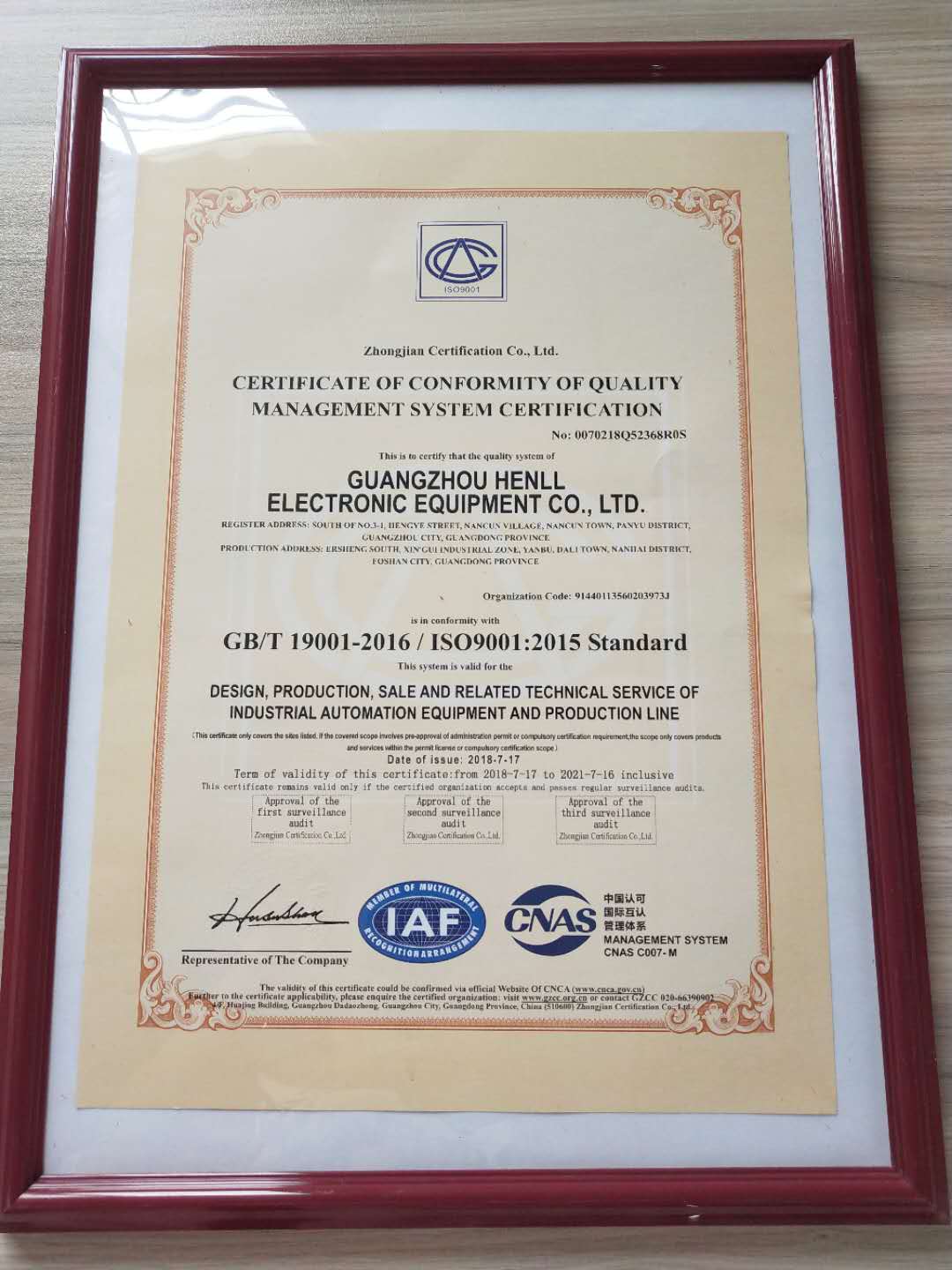 廣州恒爾電子設備公司順利通過GB/T 19001-2016/ISO9001:2015質量管理體系認證。 2018年7月10號,在以高級審核員為首的認證公司審核專員蒞臨我司進行審核,在公司專員的陪同下、全體員工的積極配合下,我司順利通過GB/T 19001-2016/ISO9001:2015質量管理體系認證,進一步證明了公司產品的高質量水平。