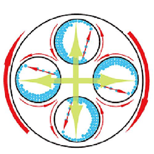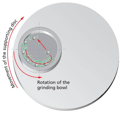 對其工作原理,我們可以通過下圖的展示進(jìn)行一個(gè)詳細(xì)的描述:行星式球磨機(jī)都有一個(gè)主盤,也叫太陽盤,在主盤上有兩個(gè)或四個(gè)安放研磨碗的底座。當(dāng)主盤轉(zhuǎn)動時(shí),研磨碗繞主盤軸公轉(zhuǎn)的同時(shí)又圍繞自身軸心自轉(zhuǎn),做行星式運(yùn)動,且其自轉(zhuǎn)方向與轉(zhuǎn)盤轉(zhuǎn)動方向相反。在行星式運(yùn)動中,研磨碗和主盤旋轉(zhuǎn)所形成的離心力作用在研磨碗內(nèi)的研磨球和物料上,由于研磨碗和主盤旋轉(zhuǎn)方向相反,所以,離心力在同向與反向間交替發(fā)揮作用,結(jié)果就是研磨球摩擦研磨碗一側(cè)的內(nèi)壁(摩擦力粉碎物料),當(dāng)?shù)竭_(dá)一定強(qiáng)度時(shí),強(qiáng)力撞擊另一側(cè)內(nèi)壁(撞擊力粉碎物料),撞擊力通過研磨球之間的相互碰撞使其作用增大。物料就是在此強(qiáng)力的沖擊力和碾壓下,得以粉碎、研磨、分散或混合。