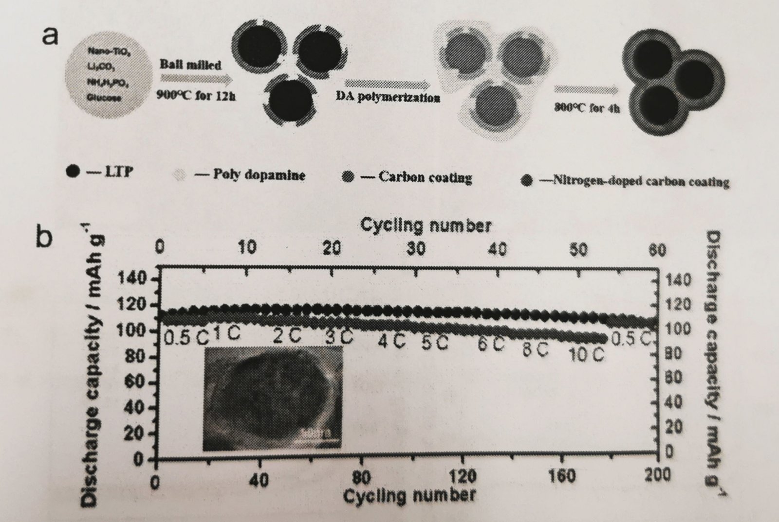 形成~200nm結晶性良好的LiTi2(PO4)3晶體顆粒;然后,將制備好的LiTi2(PO4)3顆粒均勻分散在具有弱堿性的多巴胺(DA)溶液中,均勻攪拌24h,使多巴胺生成聚多巴胺,利用聚多巴胺(PDA)的粘附效應,不僅使一些LiTi2(PO4)3顆粒團聚在一起,而卻在團聚表面均勻包覆一層粘附層;最后,將聚多巴胺包覆后的LiTi2(PO4)3在惰性氣氛下800℃煅燒4h,得到表面包覆了一層均勻的碳層的LiTi2(PO4)3/C負極材料,如圖1b所示。該碳層不僅提高了其結構的穩定性。所以,LiTi2(PO4)3/C負極在1C下的放電比容量約為120mAh g-1,循環200次之后的容量保持率高達86%;并且隨充放電電流從0.5C增至10C,LiTi2(PO4)3/C負極的放電比容量僅衰減了17mAh g-1。以上數據充分表明,本研究所制備的LiTi2(PO4)3/C負極具有高倍率性能和高循環穩定性,有望作為負極材料推廣應用于新一代的水系鋰離子電池。