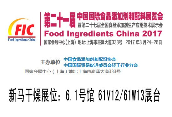 第21屆中國國際食品添加劑和配料展覽會FIC 2017將于2017年3月24日至26日在上海國家會展中心舉行。本次展會預計參展企業(yè):1400多家,展出面積10萬平米,專業(yè)觀眾近5萬人。新馬干燥在6.1號館61V12/61W13展位等待您的大駕光臨!屆時新馬會展示高速離心噴霧干燥機等產(chǎn)品。