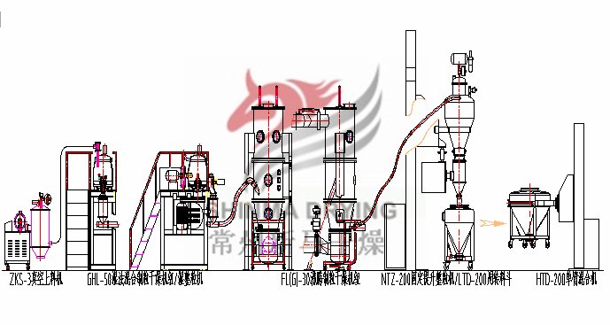 此次出口柬埔寨成套制粒聯動線設備包含高速混合制粒機(含KZL-300)、沸騰制粒機、噴嘴制粒系統等。(下圖為制粒聯動線設計方案參考圖)