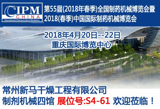 由中國制藥裝備行業協會主辦的CIPM CHINA 2018第55屆(2018年春季)全國制藥機械博覽會暨2018(春季)中國國際制藥機械博覽會,定于2018年4月20日至22日在重慶國際博覽中心召開。常州新馬干燥工程有限公司在制劑機械四館S4-61展位期待您的蒞臨!