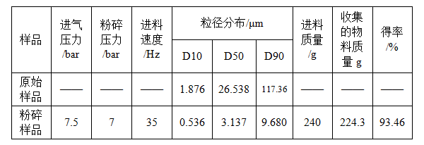 瑞舒伐他汀鈣原料藥通過JETMILL 4的雙螺桿進料器,在轉速為35Hz的條件下,進料可達到10kg/h,在進氣壓為7.5bar,粉碎壓7bar,轉速35Hz的條件下,D90為9.680μm,得率為93.46%。