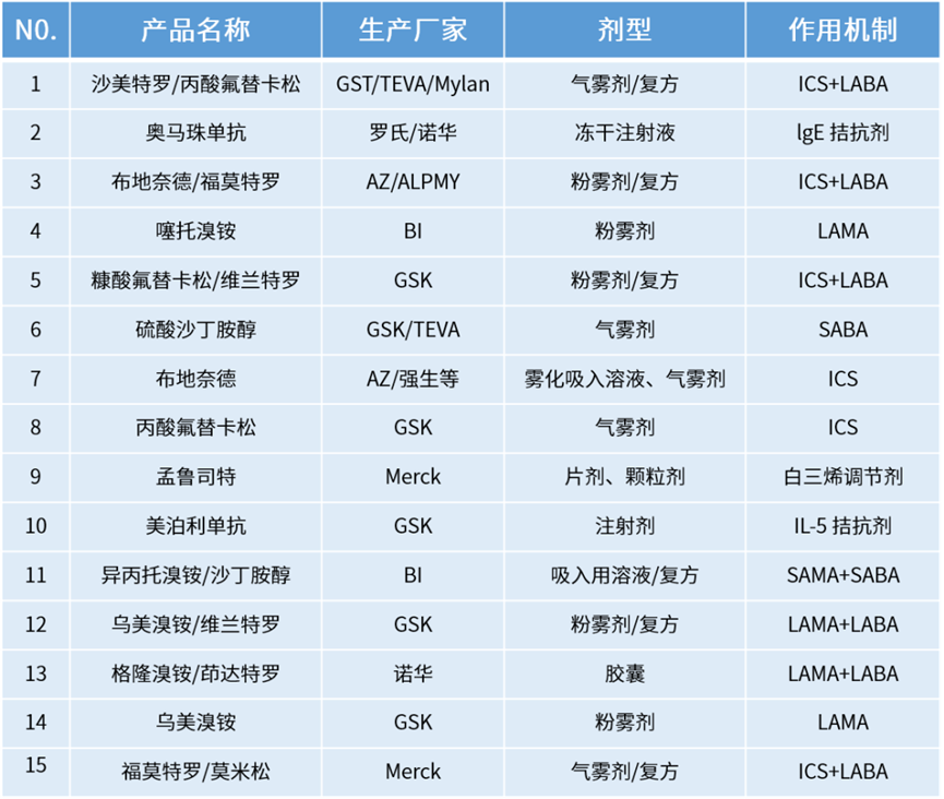 常見的慢病呼吸系統疾病所用吸入制劑類型藥物包括: