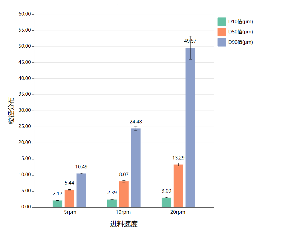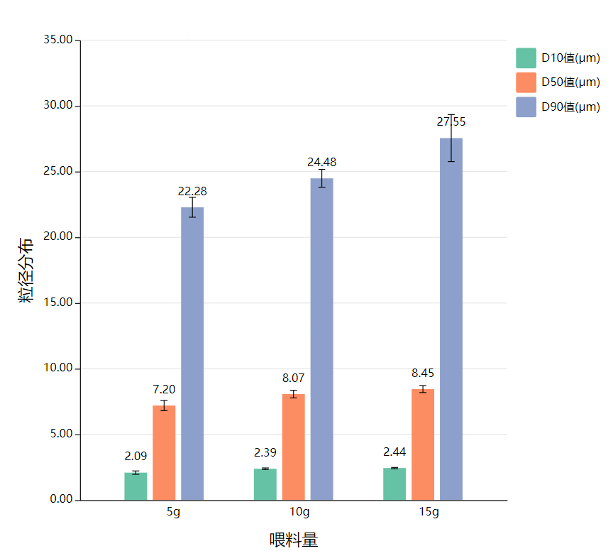 諾澤流體科技(上海)有限公司的氣流粉碎機采用的是水平式的雙螺桿進料器,通過馬達轉動帶動螺桿的運動,從而推送物料進入粉碎腔內。在恒定的轉速條件、粉碎壓力條件下,通過對不同重量物料進行粉碎處理,可以看到粒徑分布的規律:隨著喂料量的增大,粒徑分布有增長的趨勢。