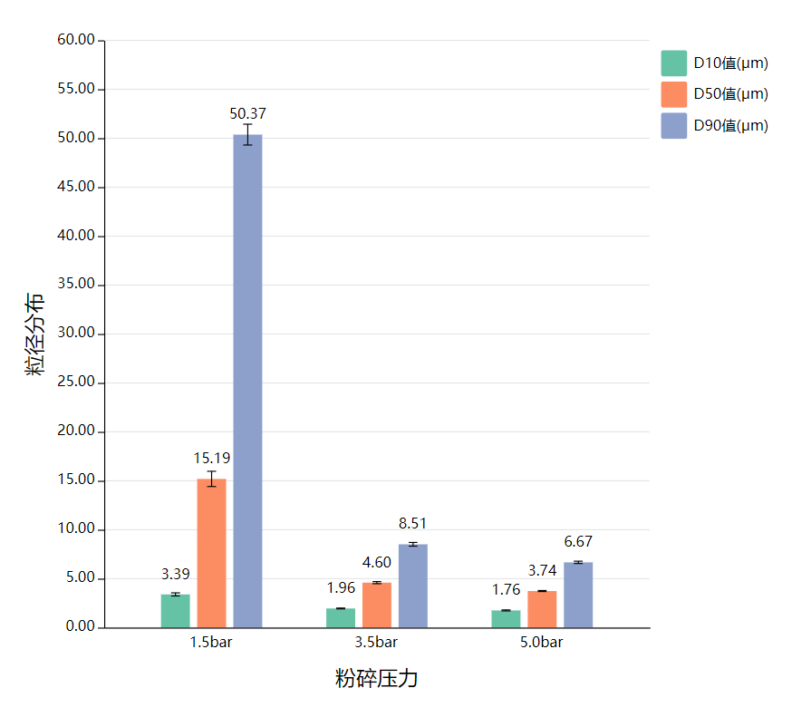 粉碎壓力大小是影響噴射氣流速度的重要因素,壓力越大,噴射氣流速度越高。被加速的顆粒在粉碎腔內碰撞速度越高,因此粉碎程度越徹底,產品粒度分布越窄。