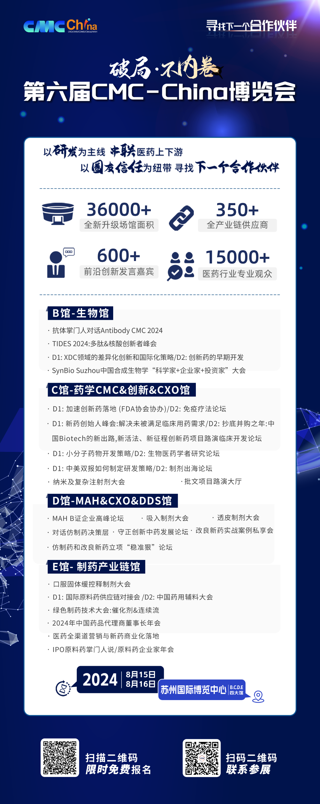 2024年8月15-16日,在蘇州博覽中心,將會舉辦第六屆CMC-China中國國際生物&化學(xué)制藥博覽會。