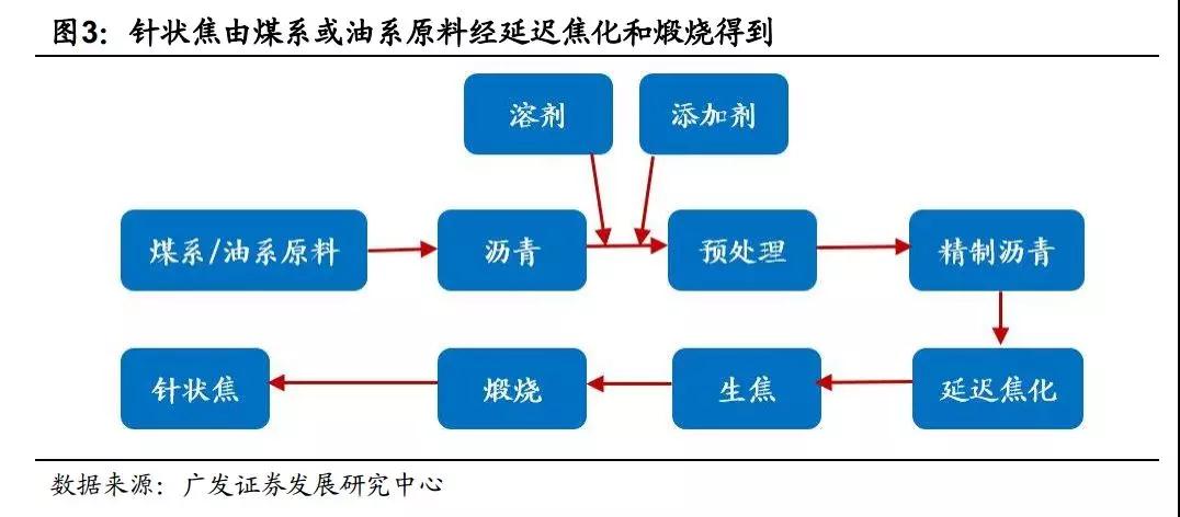 針狀焦:針狀焦是外觀具有明顯纖維狀紋理、熱膨脹系數特別低和很容易石墨化的一種優質焦炭。針狀焦物理性能的各向異性十分明顯,平行于顆粒長軸方向具有良好的導電導熱性能和較低的熱膨脹系數,因此針狀焦是制造高功率或超高功率石墨電極的關鍵原料,制成的石墨電極電阻率較低,熱膨脹系數小,抗熱震性能好。針狀焦按原料來源可分為以石油渣油為原料生產的油系針狀焦和以精制煤瀝青原料生產的煤系針狀焦兩種。根據張毅峰2013年發表于《炭素技術》期刊上的《針狀焦與石墨電極》一文,國外炭素企業生產大規格高功率和超高功率石墨電極往往首選優質油系針狀焦為主要原料焦,目前我國針狀焦以煤系針狀焦為主,油系針狀焦依賴于從日本水島公司和英國HSP公司進口