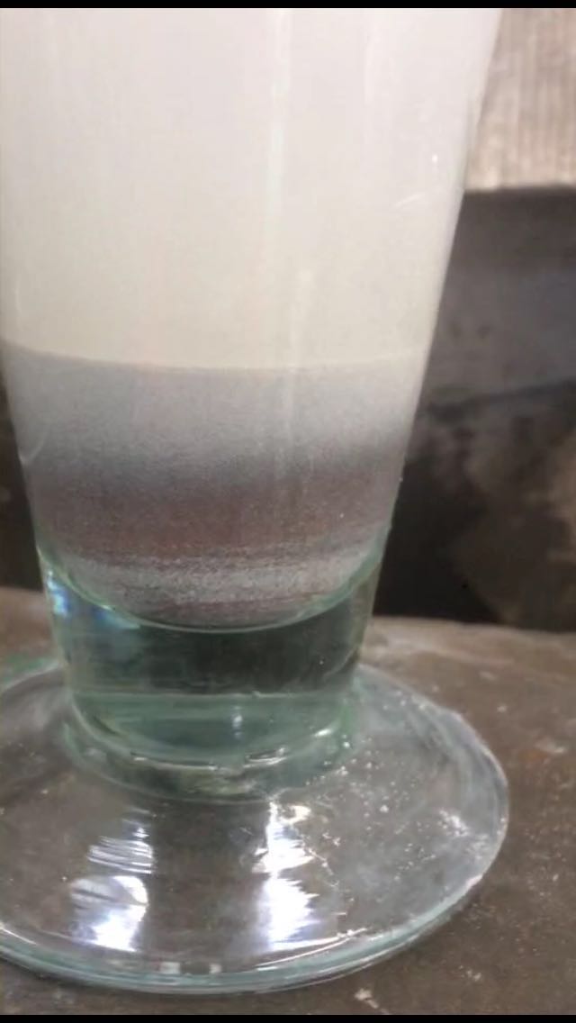 較輕白霜進入旋風收集器收集。在分級機下料口取料分析:觀察到含銅化合物與白霜分層效果明顯,白霜漂浮在上,含銅化合物比重較大沉在白霜下面,如圖一。在旋風收集器出料口取料分析:通過充分攪拌靜置后,物料下方呈現白色粉末狀,沒有分層現象,說明含銅化合物全部經分級機收集,沒有通過旋風收集器,效果明顯,如圖二。