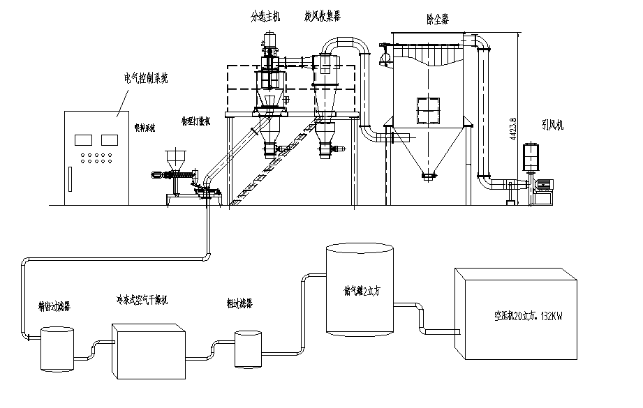 2.4.3設備選型:根據產品細度及產量要求選用10立方圓盤型氣流粉碎主機+QF700氣流分級機;分級機功率:7.5KW;風機功率:37KW。