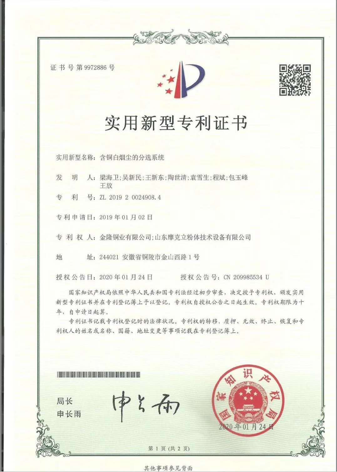 山東摩克立粉體技術設備有限公司針對該問題做出優化設計,利用空氣動力學干法分離冶金粉塵中的不同物質,采用干法分離銅的技術,回收銅等有價元素及其他元素,回收工藝結構簡單可靠,設備占地小,結構布置靈活,前后可連接其他工藝設備,不使用化學藥劑,解決了冶金粉塵的環保問題,降低了冶金粉塵回收利用的成本。本工藝可完全替代濕法分離法或作為前端工藝降低之后濕法分離的工作量。