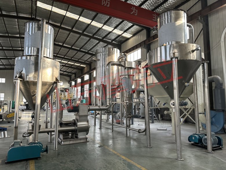 配置:羅茨風(fēng)機2臺,原料倉1座。成品倉1座,粉碎打散主機1臺,除塵器1套,旋風(fēng)收集器1臺,電控柜1臺