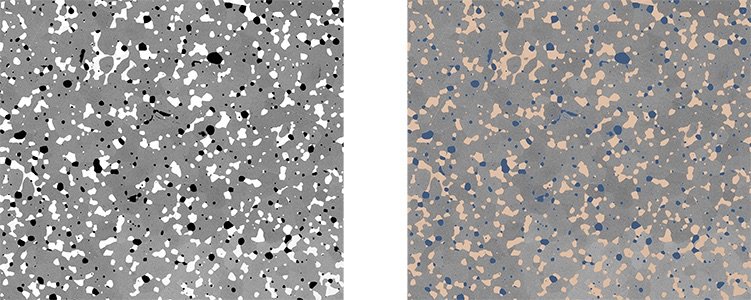 高級陶瓷材料的 30 張 Phenom SEM 圖像的拼圖(左)和晶粒分析圖像(右)