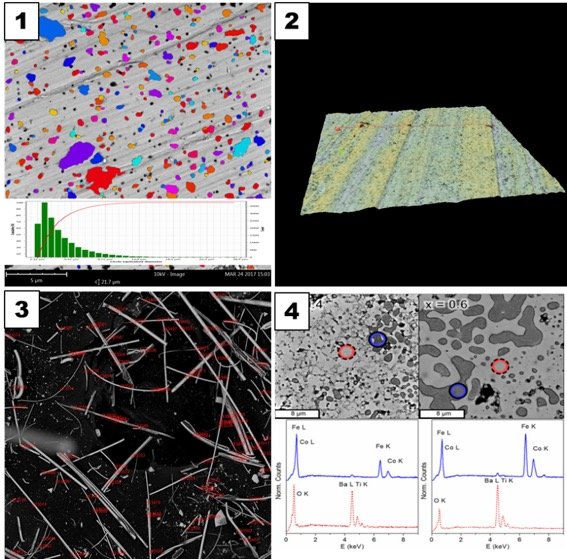 下圖1,利用顆粒系統(tǒng),對第二相進(jìn)行晶粒度統(tǒng)計,并導(dǎo)出柱狀圖;圖2,對材料表面進(jìn)行 3D 立體重建,也可以進(jìn)行粗糙度測量;圖3,利用纖維系統(tǒng),對陶瓷纖維直徑與方向進(jìn)行統(tǒng)計;圖4,利用能譜對材料進(jìn)行元素成分分析。