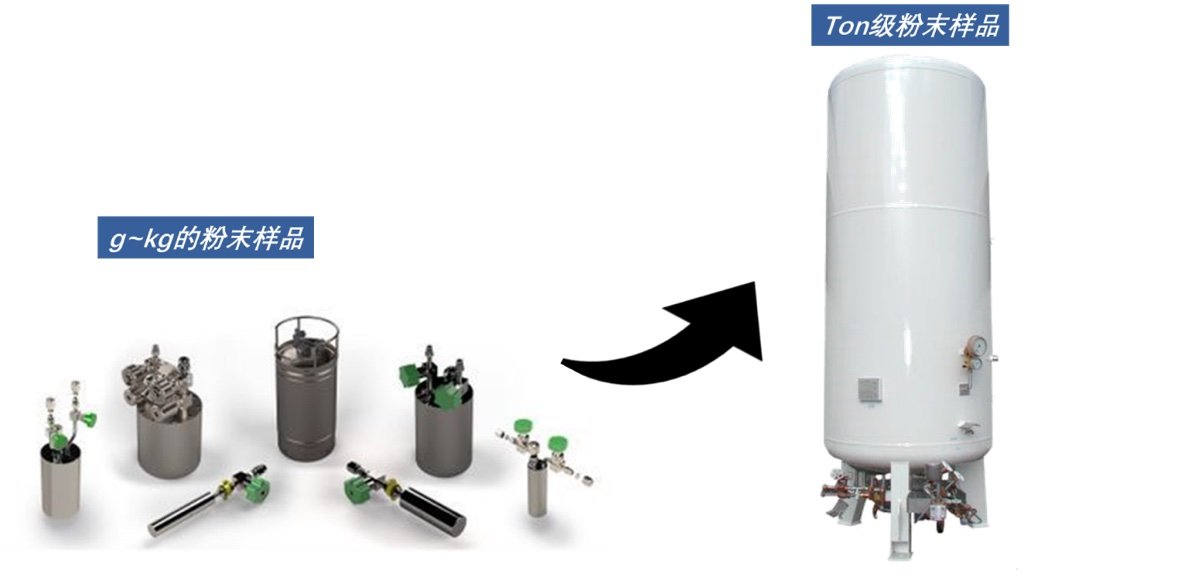高比表面積的粉末樣品不僅對前驅體的用量提出更高的要求,前驅體的存儲以及輸送方式同樣重要。對于半導體行業而言,公斤級的前驅體儲存瓶即可滿足連續的生產要求。但粉末 ALD 包覆,尤其是鋰電,金屬等粉末樣品,每年的處理量可達到噸級甚至百噸級,因此前驅體的供應需要使用更大的儲存系統。