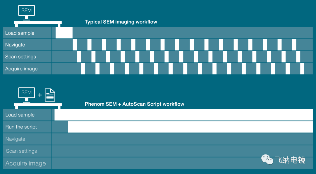 圖6. 傳統(tǒng)的掃描電鏡(SEM)成像工作流程與 Phenom XL 臺(tái)式 SEM 的自動(dòng)成像工作流程對(duì)比