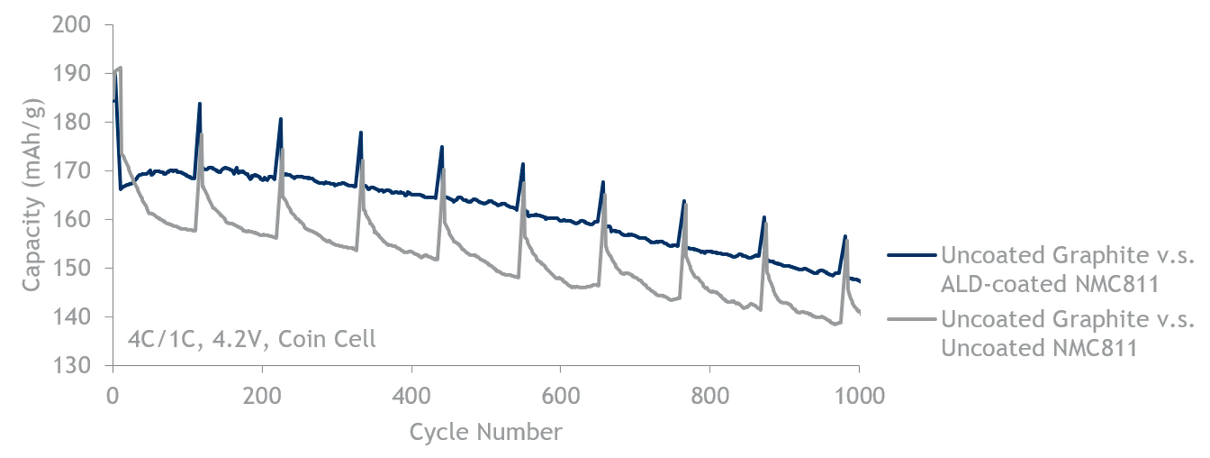 ALD 包覆 NMC811 材料在循環后擁有更好的容量保持率