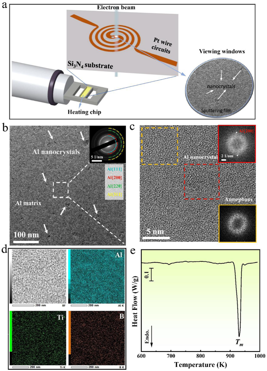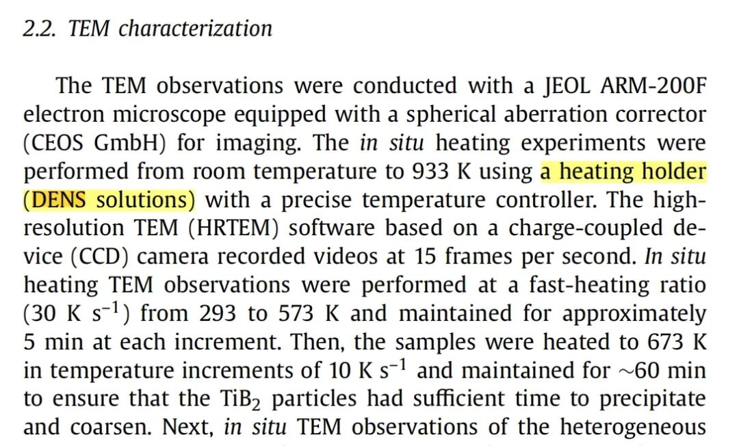 所使用的系統(tǒng)- Wildfire 加熱桿:使用 Wildfire 原位加熱樣品桿,研究團隊原位加熱過冷 Al-5Ti-1B 薄膜,在原子尺度下觀察了鋁在 TiB2 顆粒上的異質(zhì)成核和生長動力學,并闡明了鋁核的應變依賴性生長動力學。