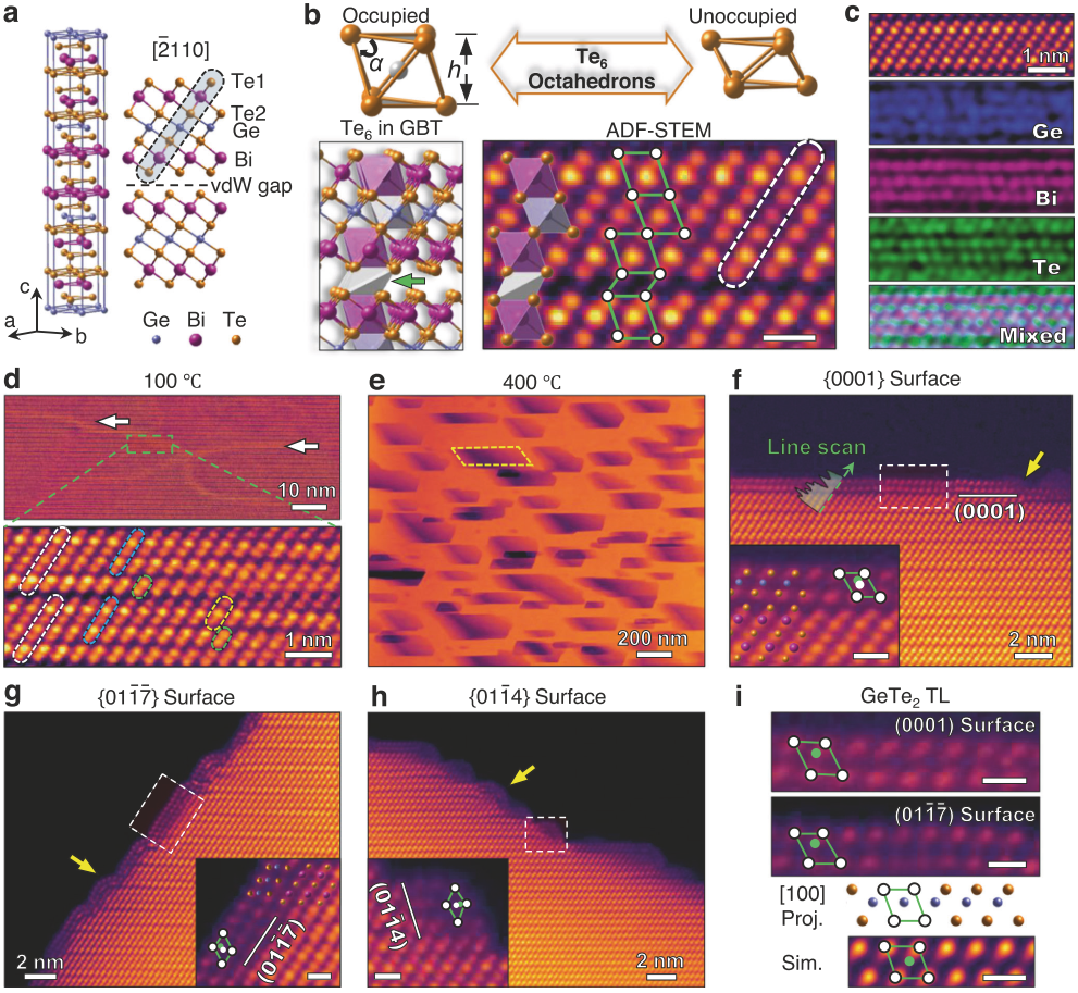 弱層間范德華(vdW)鍵合對 vdW 層狀材料的表/界面結構、電學性能和輸運性能具有顯著影響。因此,解開 vdW 表面復雜的原子動力學和結構演化對于下一代 vdW 層狀材料的設計和合成至關重要。該工作表明,使用原位加熱 STEM 可以直接觀察到層狀GeBi2Te4(GBT)中 Ge/Bi 陽離子沿 vdW 間隙的擴散。基于對原子柱強度和隨時間推移的 STEM 圖像位置的定量分析,擴散過程中的陽離子濃度變化與局部 Te6 八面體畸變相關。面內(nèi)陽離子擴散通過復雜的結構演化導致晶面外表面蝕刻。這些結構演化包括,在新鮮 vdW 表面上非中心對稱 GeTe2 三層表面重構的形成和傳播,以及從七層到五層的 GBT 次表面重構層。該工作提供了對 vdW 層狀材料中陽離子擴散和表面重構的原子層面洞察。