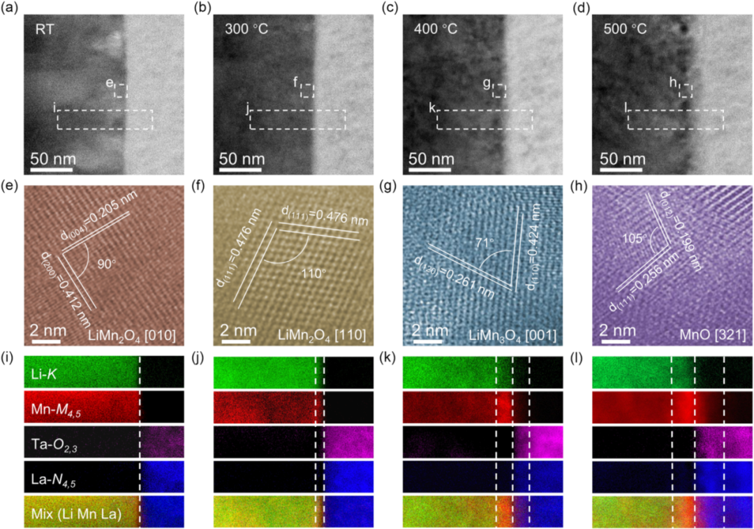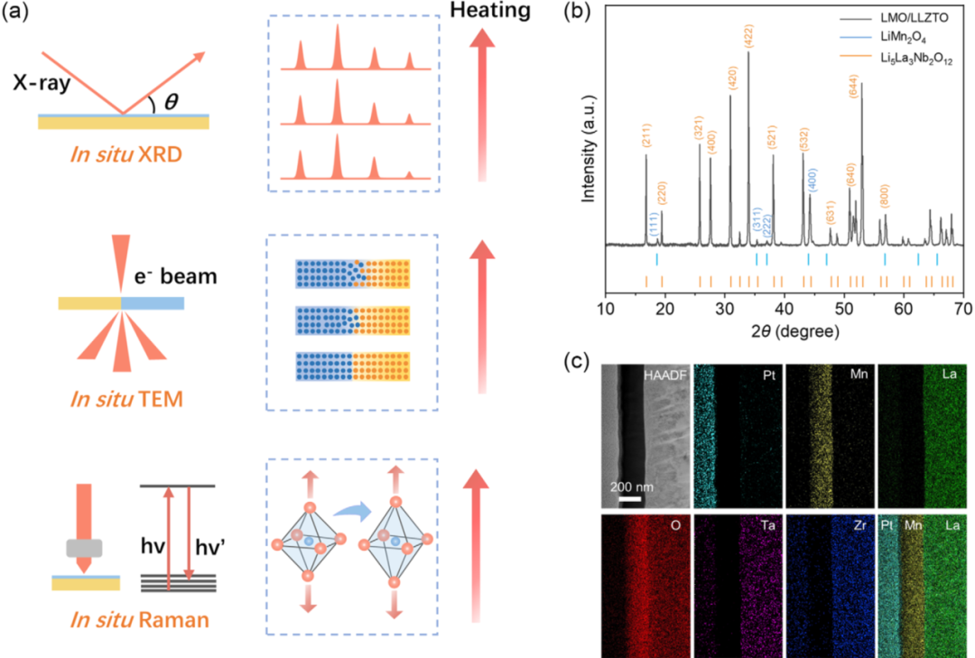 摘要:電極/電解質(zhì)間界面對全固態(tài)電池的性能起著決定性作用。例如,正極/電解質(zhì)間界面相的形成會影響界面阻抗,從而影響倍率性能。本文通過組合原位技術,包括原位 XRD、原位 TEM 和原位拉曼,研究了 LiMn2O4 正極和LLZTO電解質(zhì)之間固/固界面的熱穩(wěn)定性,闡明了不同尺度下界面反應的動態(tài)過程。從 300 °C 開始,LiMn2O4 中的Mn離子遷移到固態(tài)電解質(zhì)中,同時形成 LiMn3O4 中間相。當溫度升高到 500 °C時,LiMn3O4 界面轉(zhuǎn)變?yōu)?MnO 結構,這阻礙了鋰離子的傳輸,從而增加了界面阻抗。雖然 LiMn2O4 和 LLZTO 都可以承受連續(xù)加熱,但它們的界面在較低溫度下本質(zhì)上是熱不穩(wěn)定的,這在實際制造的熱處理過程中需要特別注意。該研究結果提供了對界面反應的機理見解,為全固態(tài)電池的設計和制造提供了指導意見。