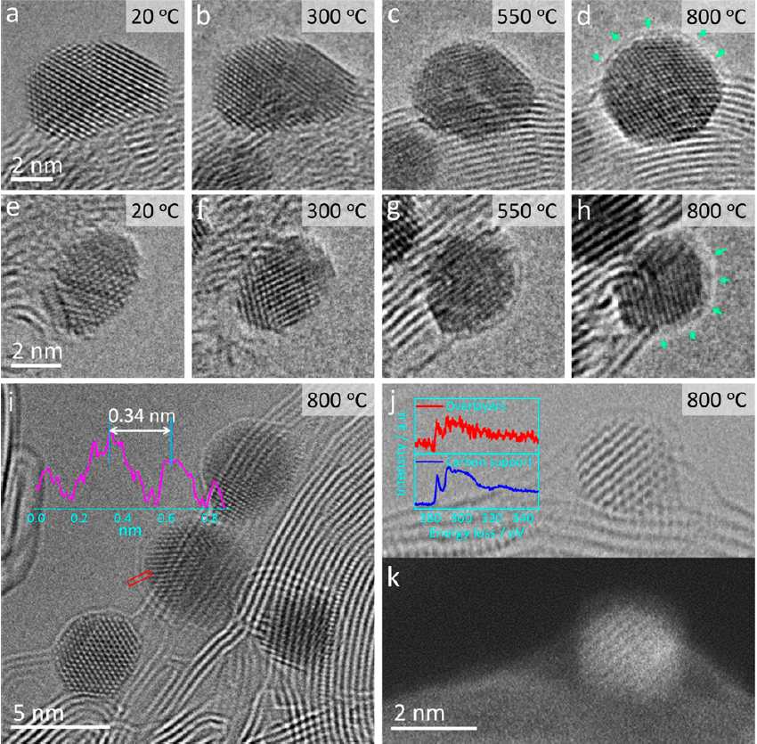 摘要:該團隊使用原位 TEM、非原位 TEM 與原位 XPS 相結合,研究銥/碳催化劑中碳對銥納米顆粒的包覆,并實時觀察了真空中加熱銥/碳時的顆粒重塑和碳載體石墨化程度的改變。原位 TEM 表明,加熱到 550°C 時,銥納米顆粒表面開始形成碳包覆層。碳層形成后,800°C時沒有觀察到銥納米顆粒的燒結和遷移。但初始銥納米顆粒 550°C 或以下發(fā)生燒結,具體溫度與不完全包覆程度有關。當溫度從 800°C 降低到 200°C 時,碳層會起皺,該過程與顆粒表面重構相關,且是可逆的。溫度升高回 800°C后,包覆層回歸光滑狀態(tài)。碳層包覆后的銥納米顆粒在析氫反應中的催化性能高于初始(非包覆)的銥/碳顆粒。該工作展示了目前正在研究的負載型貴金屬納米顆粒碳包覆現(xiàn)象的微觀細節(jié),并進一步證明了碳包覆是調(diào)節(jié)催化性能的有效措施。