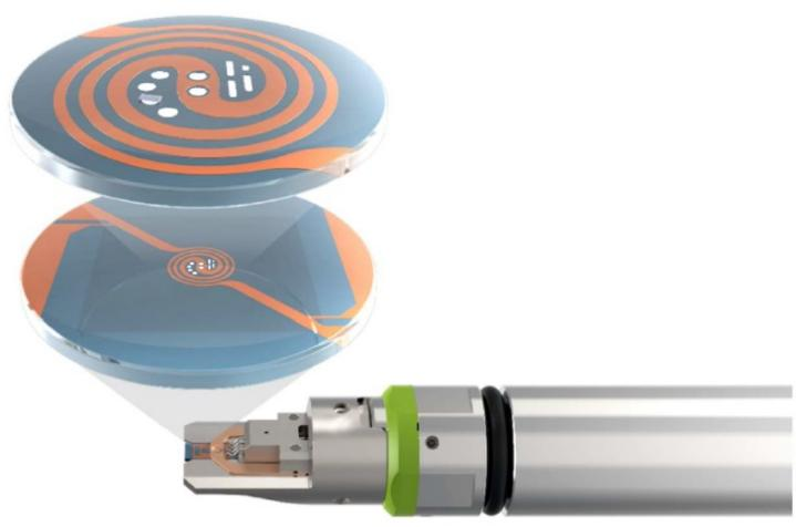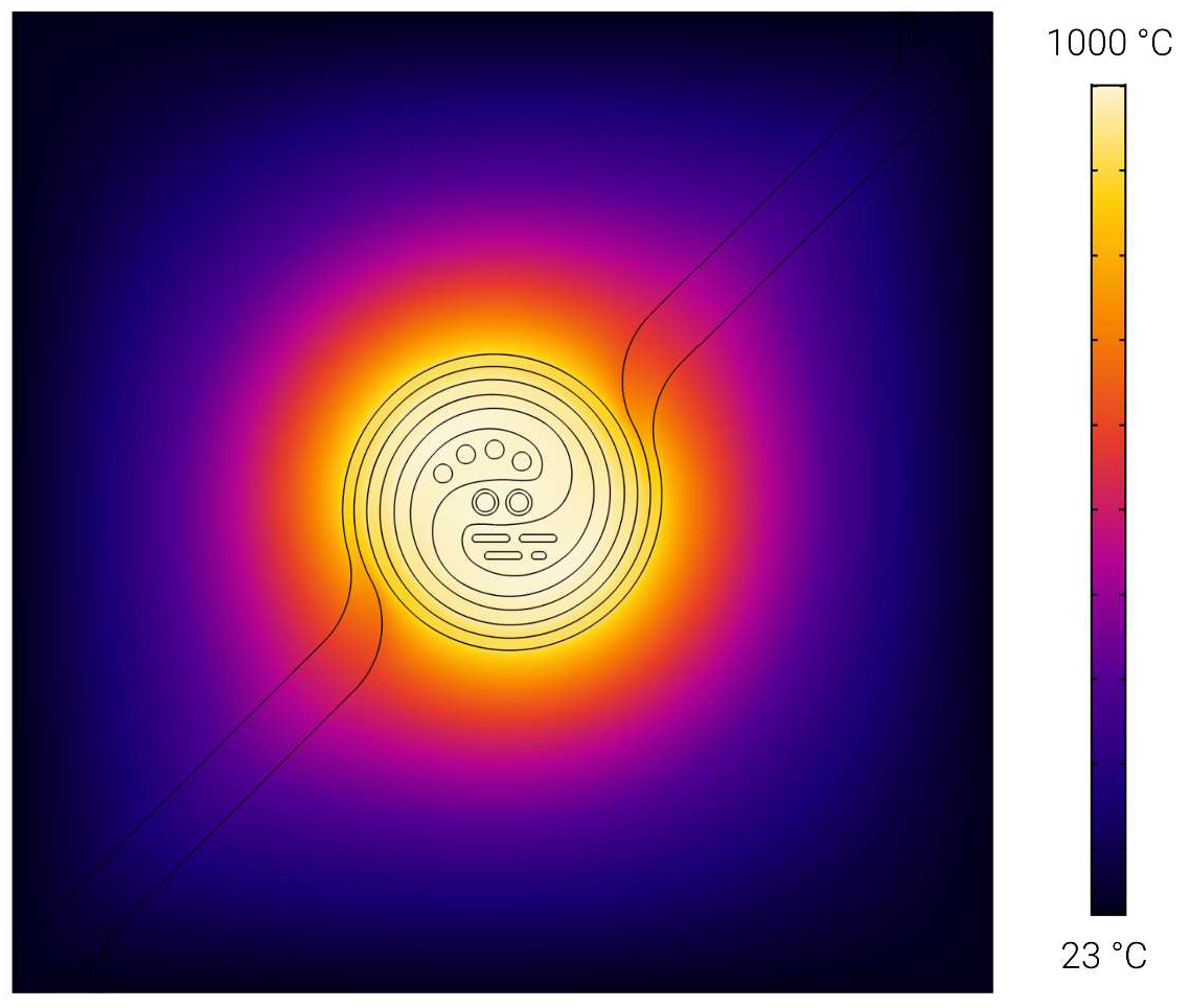 前文我們提到,微線圈的加熱原理是把電能轉換成熱能。這種焦耳生熱的效率與電阻有關——電阻越大產生的熱量就越多。下圖中我們可以看到,加熱線圈外圍導線明顯較細,而內圈導線較寬。這樣外圍線圈產生的熱量較多,內圈產生的熱量較少,一定程度上可以抵消由中心向外圍的溫度梯度。如果是導線粗細一致,產生熱量相同,毫無疑問中心溫度會更高,自然就會有由內向外的溫度由高到低的梯度。采用這樣的設計,加熱區域的溫度均勻性也就無法得到保證。