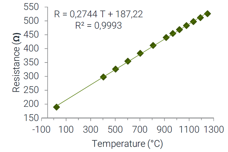 回想高中物理知識,大家或許還記得金屬的電阻隨著溫度的升高而增大。實際上,金屬電阻和溫度成線性關系(圖 2),而直線斜率就是電阻溫度系數 (Temperature Coefficient of Resistance, 簡稱 TCR)。知道了 TCR 和某一溫度下的電阻,我們就可以確定溫度與電阻的對應關系。在這種情況下,溫度數值和電阻數值一一互相對應。知道了電阻,就可以計算出溫度,反之亦然。