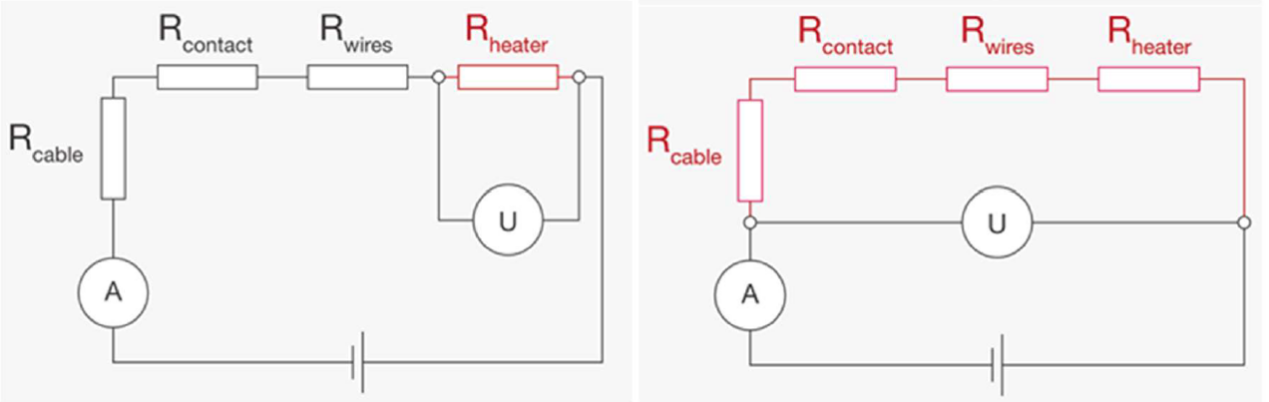 圖 3:四探針法測電阻(左)和傳統測量方法(右)