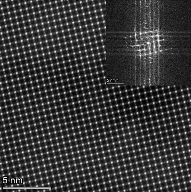 圖 1 : -170 ℃下拍攝的方硼石 FIB 樣品 STEM 照片,右上方為傅里葉變換圖像