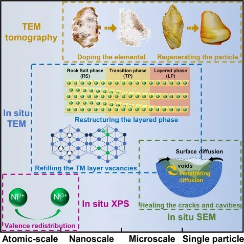 對于廢棄鋰離子電池的退化正極材料的直接再生利用是一種環(huán)境可持續(xù)、且性價比較高的“變廢為寶”策略。然而,微觀層面的再生機制和相應(yīng)過程的動力學(xué)仍舊處于未知狀態(tài)。該工作中,研究者們試圖通過多種方法展現(xiàn)了退化 NCM523 材料的再生機制。并使用了一系列的原位(TEM、SEM、同步輻射 XPS)、非原位(TEM 重構(gòu)、EDS 重構(gòu)、電化學(xué)測量)表征技術(shù)建立了 NCM523 再生機制的完整物理化學(xué)圖像。之后從原子尺度、納米尺度、微米尺度直至單顆粒水平,對包括巖鹽相到層狀相的逆轉(zhuǎn)變、缺陷(空洞、裂紋)愈合、金屬離子的價態(tài)轉(zhuǎn)變在內(nèi)的重要動力學(xué)細節(jié)進行了討論。最后,通過系統(tǒng)性的理論分析和全電池電化學(xué)測試對上述細節(jié)進行了補充討論。該研究為退化正極材料的直接再生利用提供了深入的理解,對將來開發(fā)和優(yōu)化電池材料的再生策略具有啟發(fā)意義。