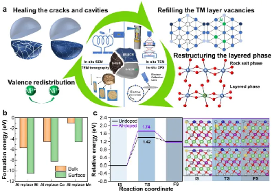 圖 2. a. 多尺度觀察 NCM523 材料直接再生機制的示意圖;b. NCM523 結(jié)構(gòu)塊體、表面鋁離子分別替換鎳離子、鈷離子、錳離子的形成能對比;c. 鋁摻雜和未摻雜的 NCM523 的鎳從 TM 層到鋰層的擴散勢壘。