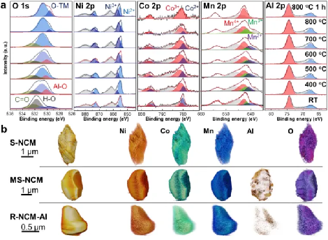 圖 3. a. MS-NCM 樣品燒結(jié)時,氧1s、鎳2p、錳2p、鋁2p的原位同步輻射 XPS 譜;b. NCM523 顆粒的 3D 透射電鏡重構(gòu)圖,以及對應(yīng)的鎳、鈷、錳、鋁、氧元素的能譜重構(gòu)圖。