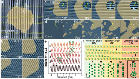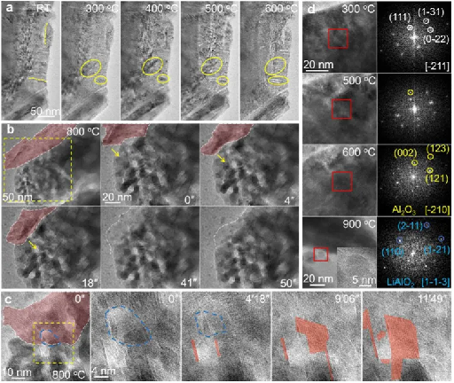 圖 5. a. 原位 HRTEM 圖像記錄了從室溫到 600 ℃ 時鋁包覆層遷移到 NCM523 顆粒裂縫的過程;b. 原位 HRTEM 圖像反映了 800 ℃ 時 NCM523 晶粒中補充鋁的擴散過程;c. 原位 HRTEM 圖像展示了 NCM523 顆粒的表面空位的熱愈合過程。