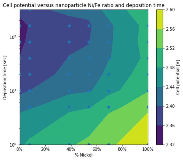 等值線圖顯示電池電位隨鎳/鐵發生器功率比和沉積時間的變化