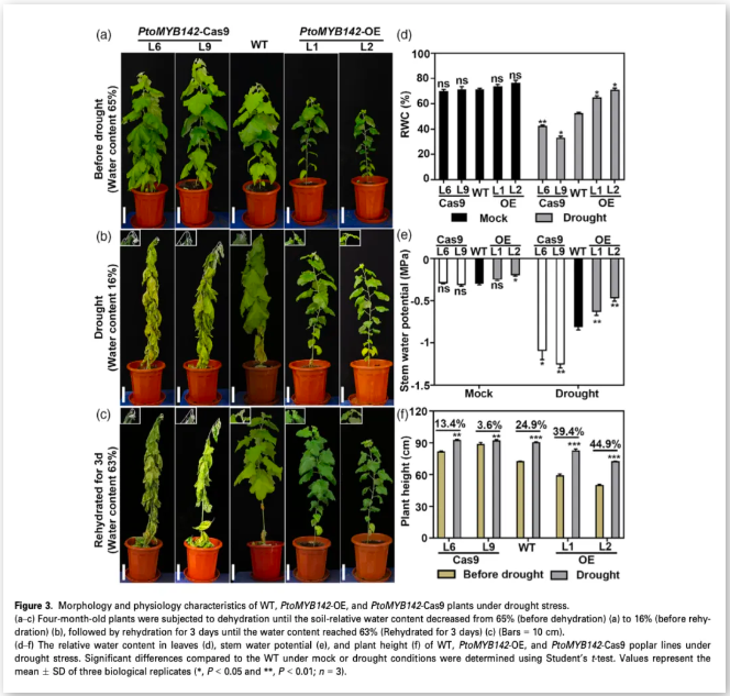 總體而言,我們的研究強調了 Pto-MYB142 在調控楊樹植物結構和耐旱性中的關鍵作用,并提供了對植物生長與干旱響應之間串擾的分子機制的見解(圖8)。我們的 研究結果表明,PtoMYB142 的過表達可能是提高楊樹植株抗旱性的一種有前途的策略。