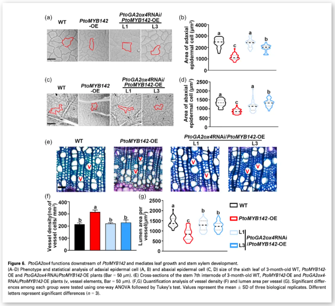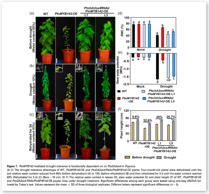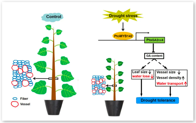 PtoMYB142 通過直接結合干旱脅迫誘導的 PtoGA2ox4,aGA-氧化酶基因的啟動子來調節赤霉素(GAs)解代謝。相反,CRISPR/Cas9 系統敲除 PtoMYB142 會降低抗旱性。結果表明,在干旱脅迫下,葉片尺寸和導管管腔面積的減小以及荊糠密度的增加提高了葉片相對含水量和莖稈水勢。此外,外源 GA3 的應用挽救了 PtoMYB142 表達植株的 GA 缺陷表型,并逆轉了其抗旱性。通過抑制 PtoGA2ox4 的表達,抑制了 PtoMYB142 表達楊樹 GA 缺陷特性的表現,以及賦予的抗旱性。