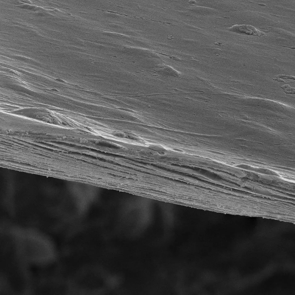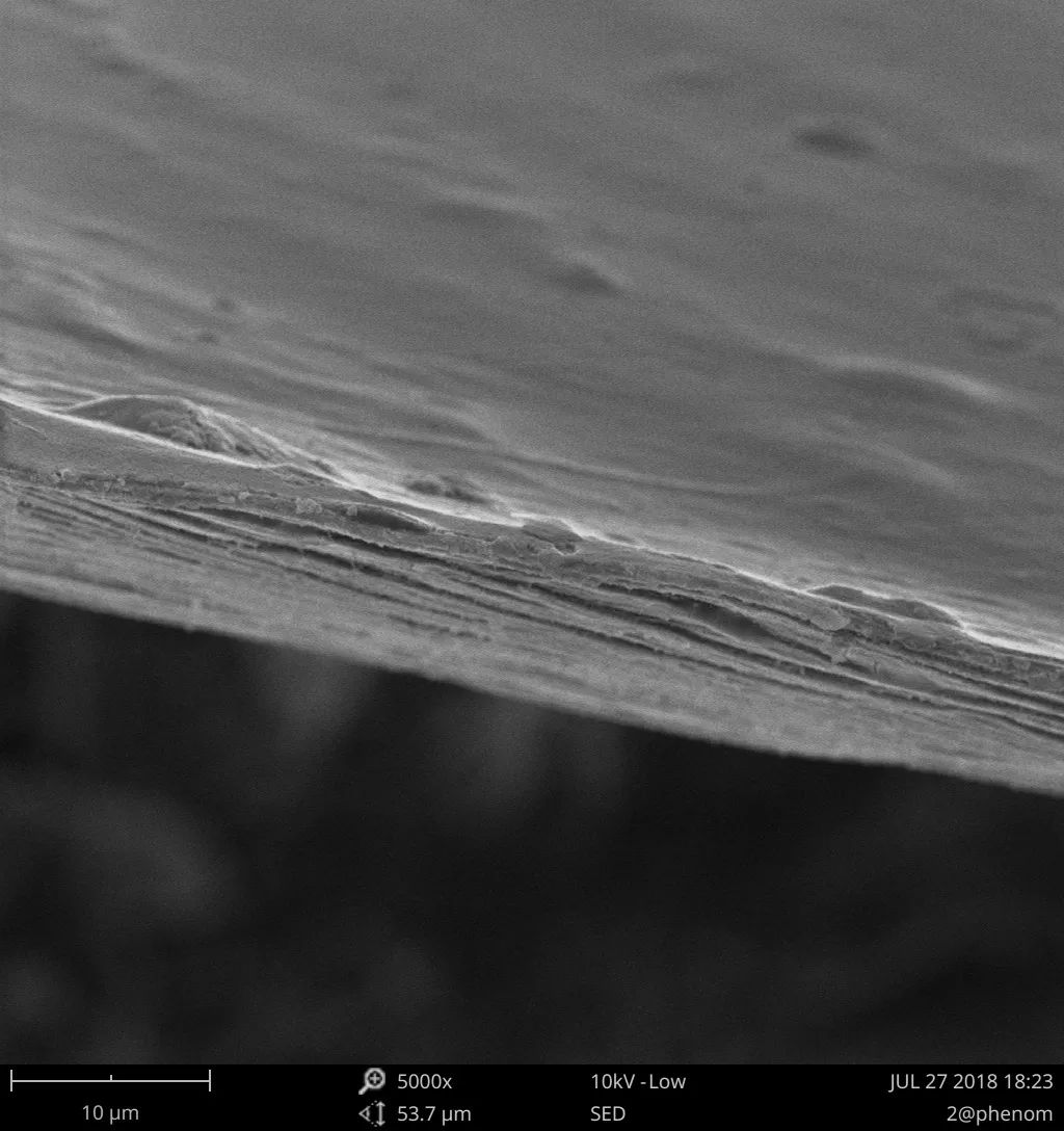 但是,我們也同樣需要明確,掃描電鏡的景深分辨能力并非無(wú)限大。在遇到一些極其特殊的樣品時(shí),比如幾乎垂直放置的多層膜材料(圖 5),即使是掃描電鏡也難以表現(xiàn)其全部細(xì)節(jié)。