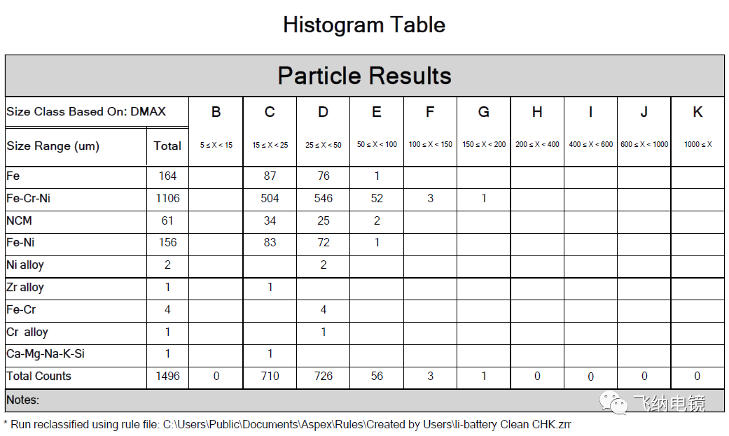 雜質的分析結果嚴格按照 VDA19 要求的格式呈現,顆粒分類統計結果更有助于評估鋰電池生產的清潔度情況,方便不同批次樣品的對比,以及生產工藝調整的驗證。