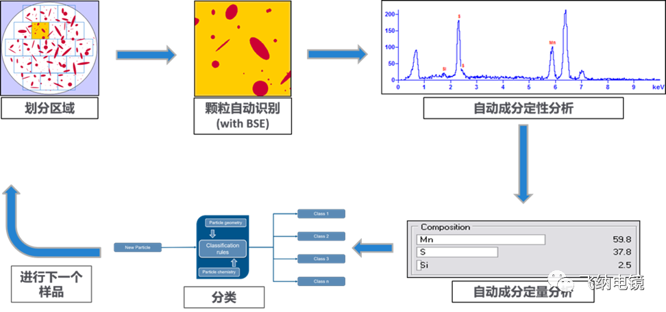 檢測原理:以掃描電鏡 + 能譜儀為硬件基礎,通過背散射成像的明暗襯度識別顆粒,進而對顆粒進行能譜成分分析,根據顆粒形貌和成分信息對其智能分類,并且可以一鍵生成檢測結果的報告。